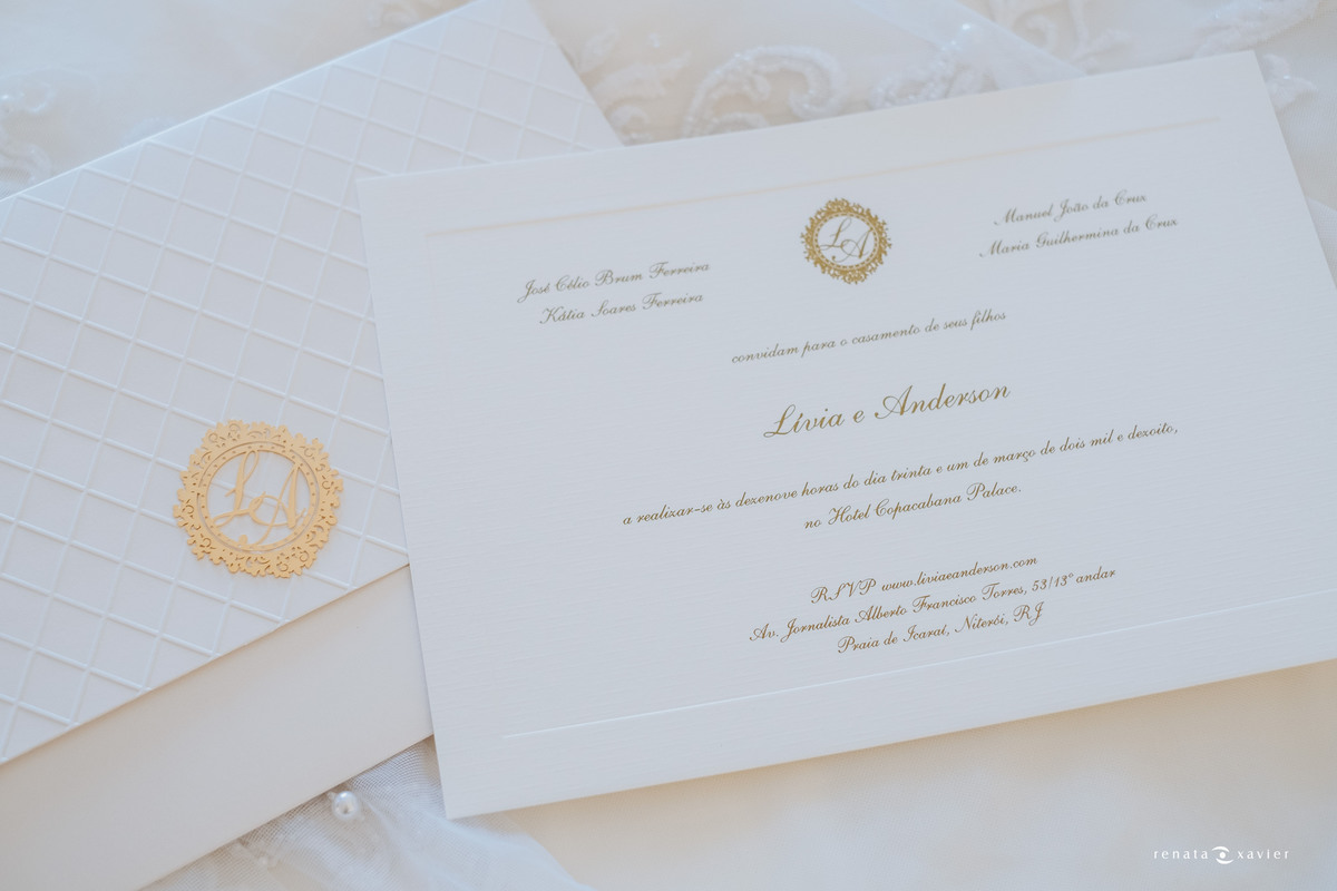 Local: Hotel Copacabana Palace | Decoração: Daniel Cruz | Maquiador: Lucas Vieira | Vestido: Stella Fischer | Pastor: Longuine | Dj: Rodrigo Setta | Floristas: A Roseira | Cerimonial: Paula Rocha | Buffet: Hotel Copacabana Palace | Equipe de fotografia: Renata Xavier, Leandro Lucas, Vanessa Magalhães e Gabriel Pulitini | Vídeo: Amarelinha Filmes