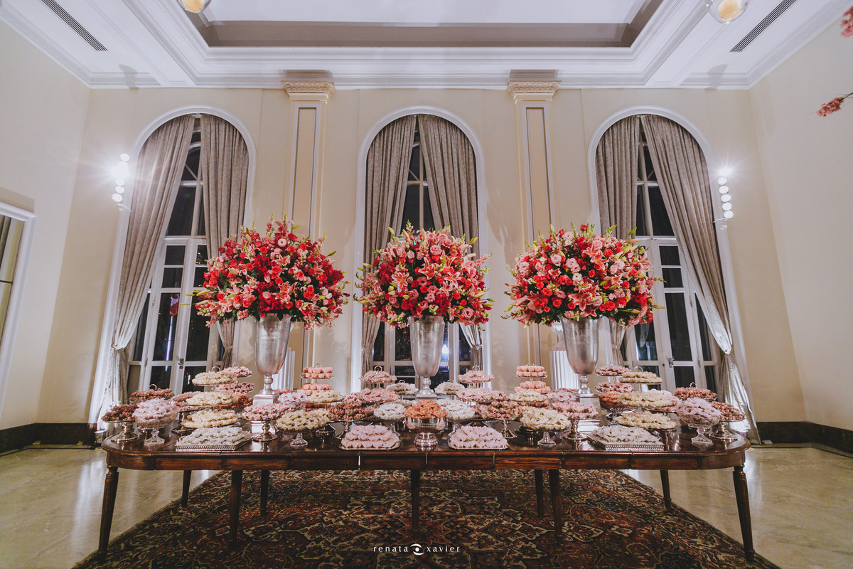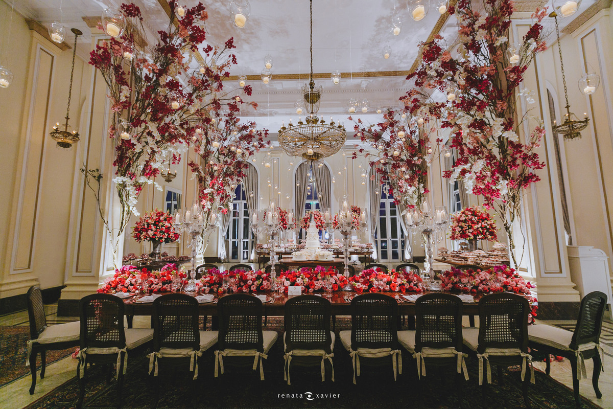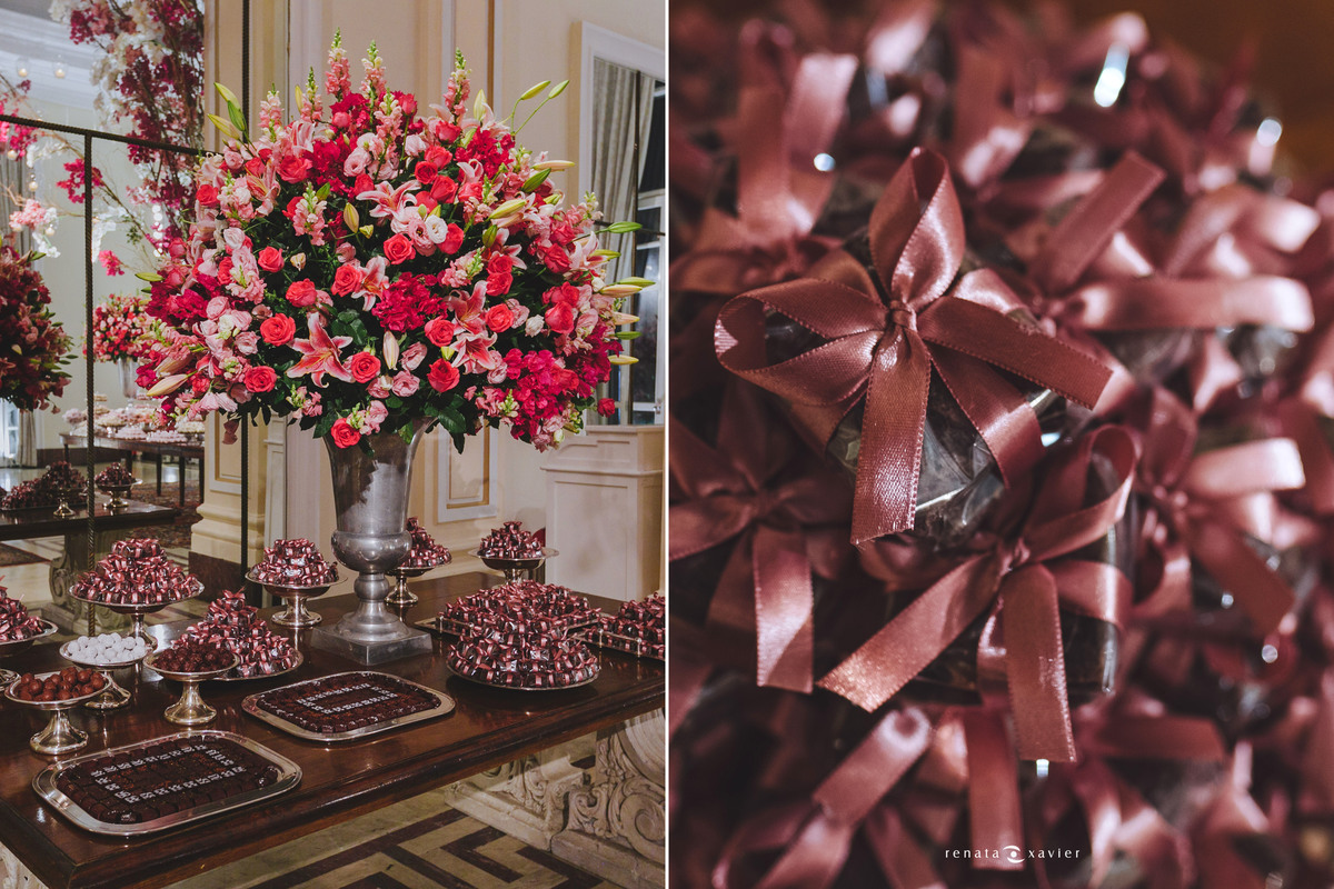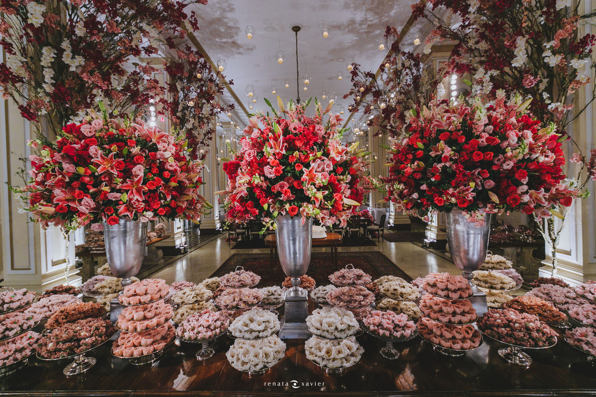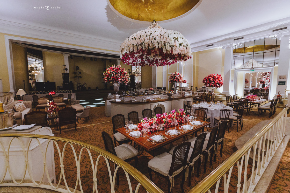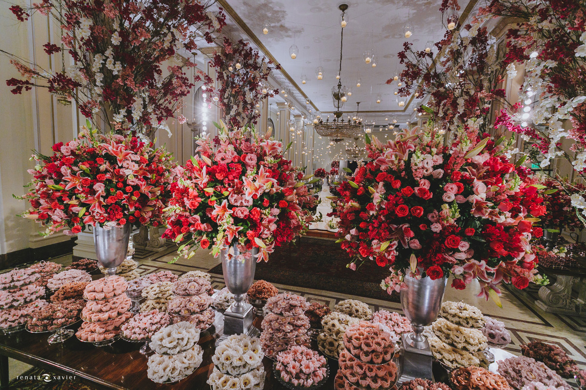 A decoração que o Daniel Cruz fez nos salões do Copacabana Palace estava um escândalo! Nos salões frontais, onde aconteceria a cerimônia, milhares de rosas e lisianthus brancos formavam o caminho dos noivos até o altar. No salão nobre do Copacabana Palace, uma mesa de doces no estilo La Vie en Rose, a mesa de jantar com a guirlanda de flores que ia até o chão. Os tetos estavam repletos de glicinias e bouganvilleas, o ponto alto era o candelabro gigante todo florido em cima do bar no Golden Room... Os convidados suspiravam...