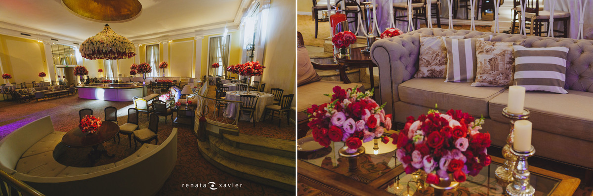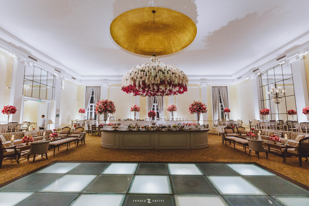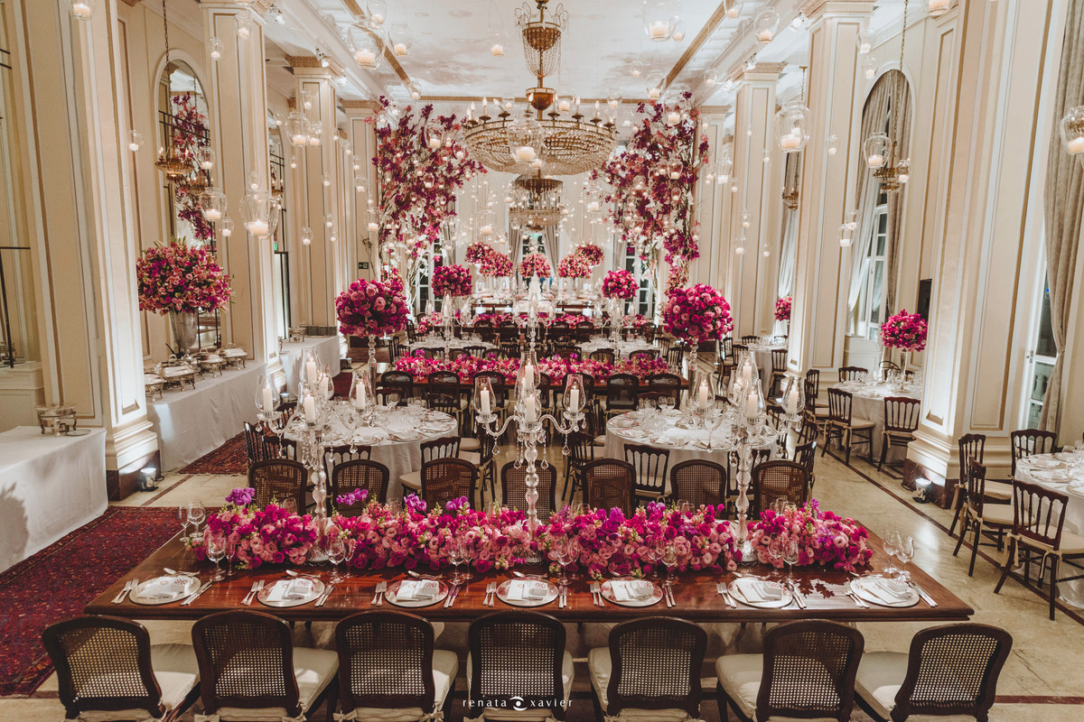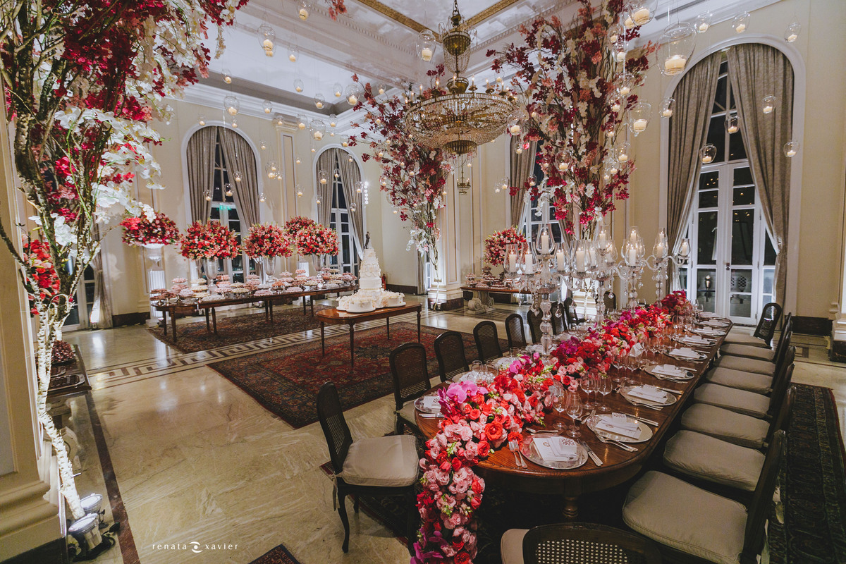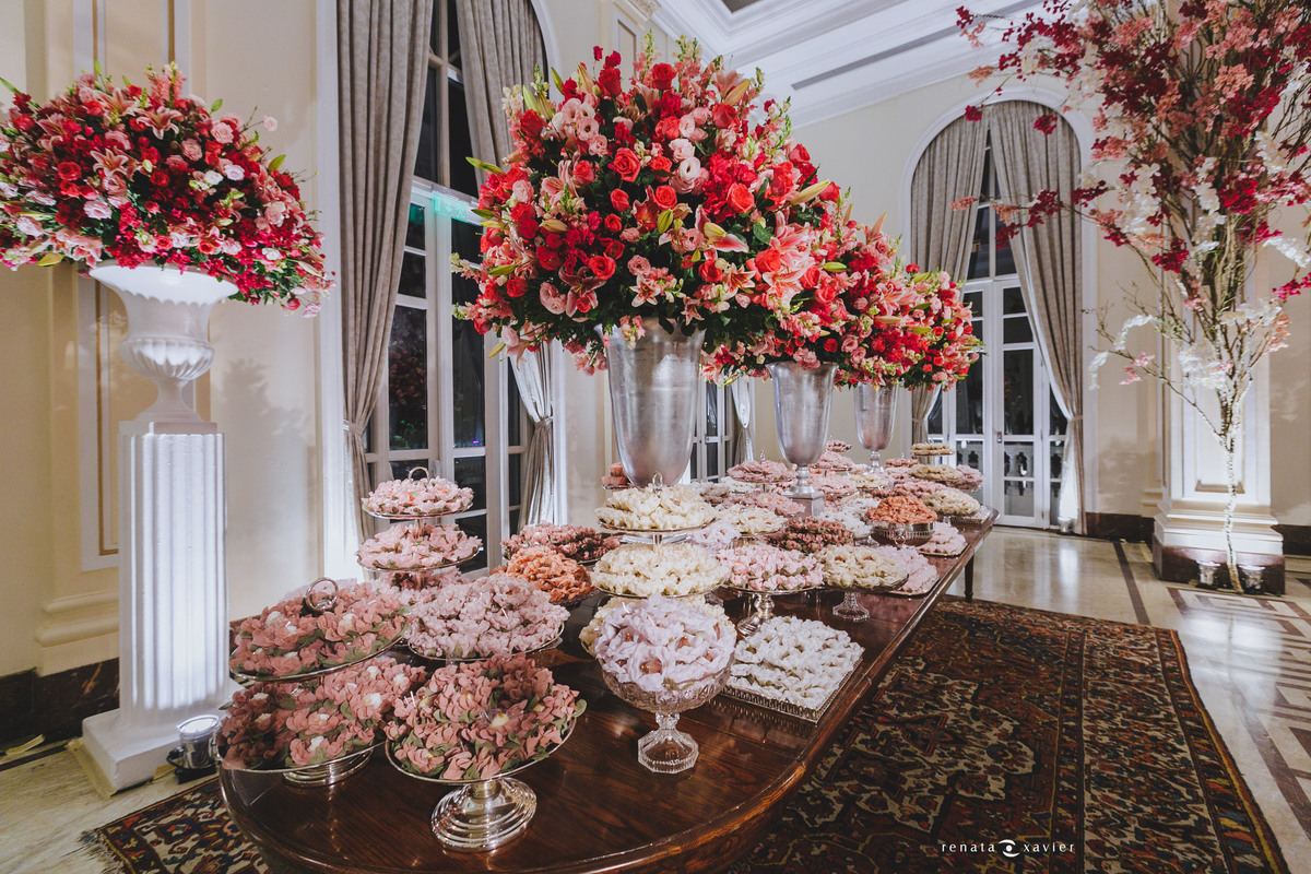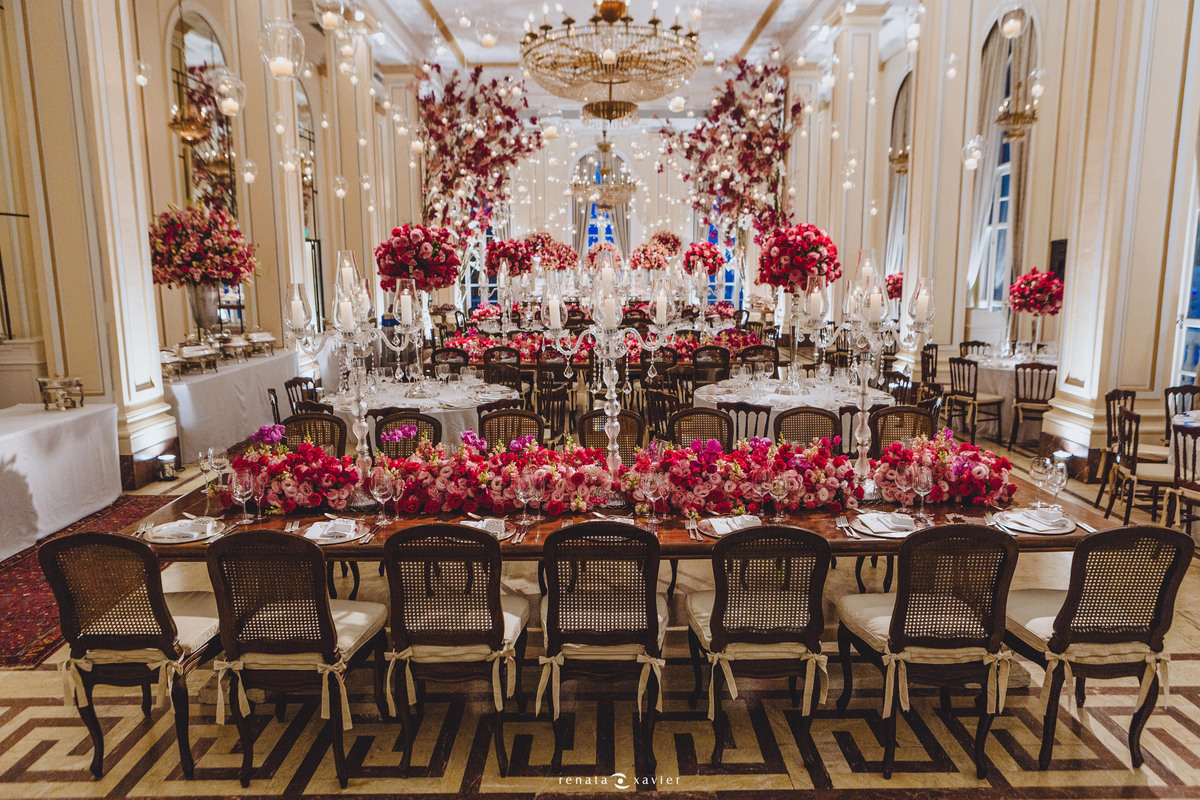 A decoração que o Daniel Cruz fez nos salões do Copacabana Palace estava um escândalo! Nos salões frontais, onde aconteceria a cerimônia, milhares de rosas e lisianthus brancos formavam o caminho dos noivos até o altar. No salão nobre do Copacabana Palace, uma mesa de doces no estilo La Vie en Rose, a mesa de jantar com a guirlanda de flores que ia até o chão. Os tetos estavam repletos de glicinias e bouganvilleas, o ponto alto era o candelabro gigante todo florido em cima do bar no Golden Room... Os convidados suspiravam...