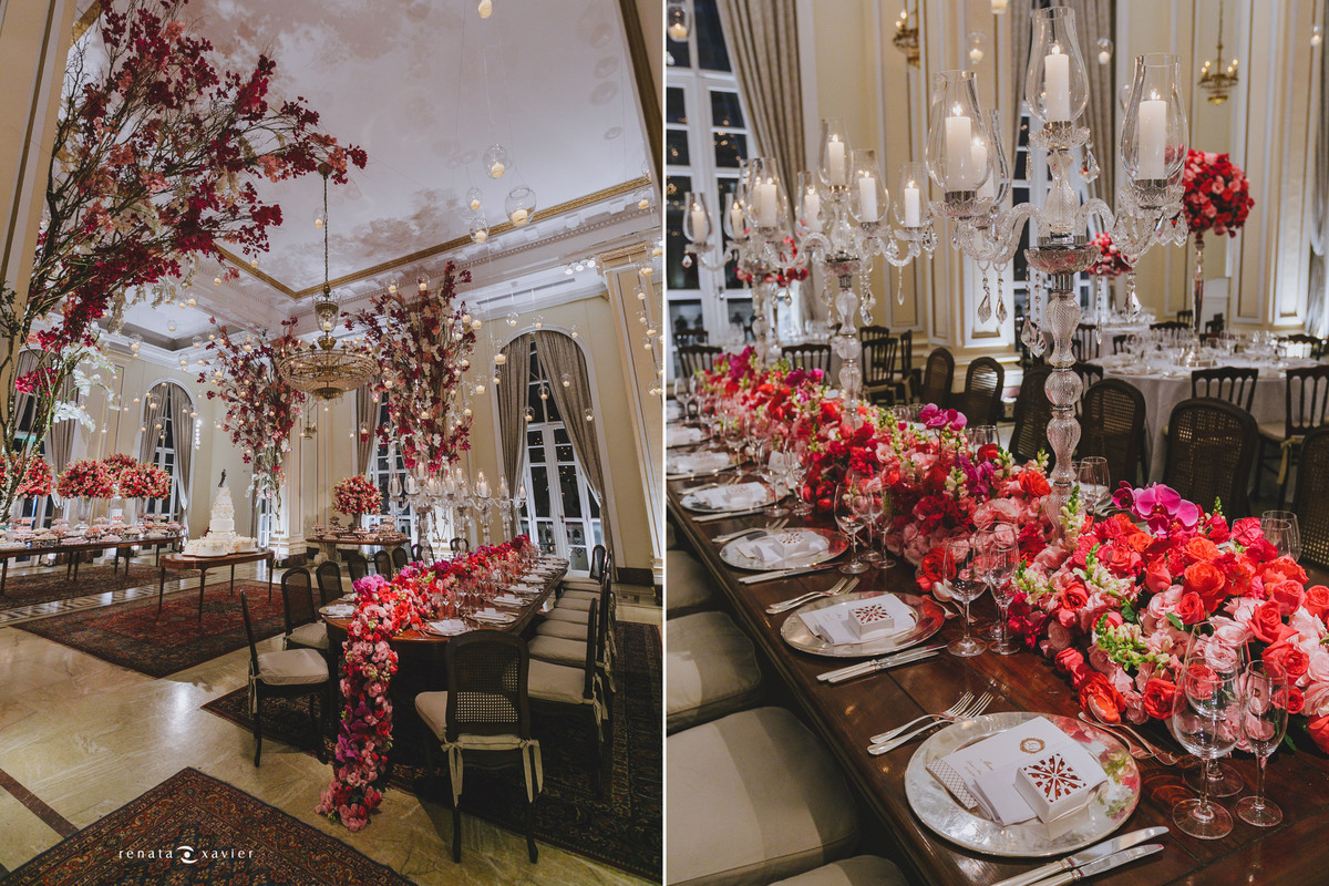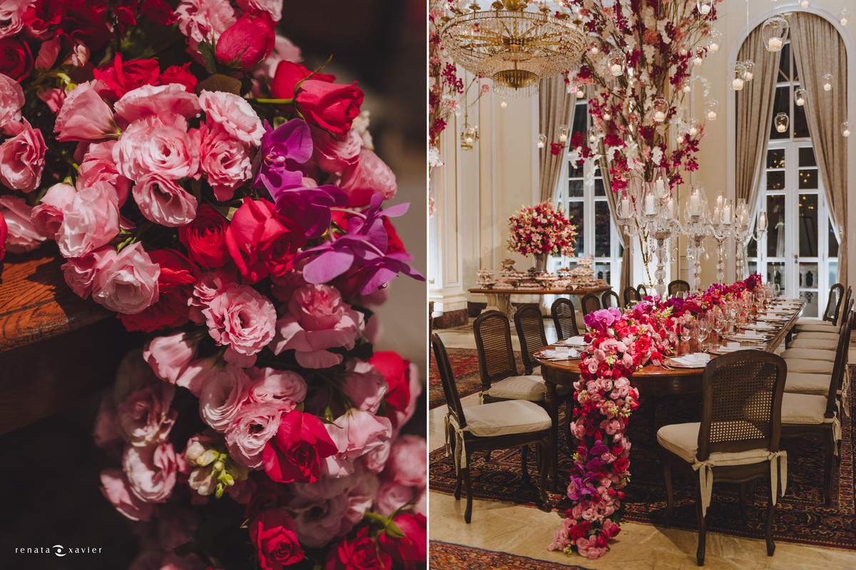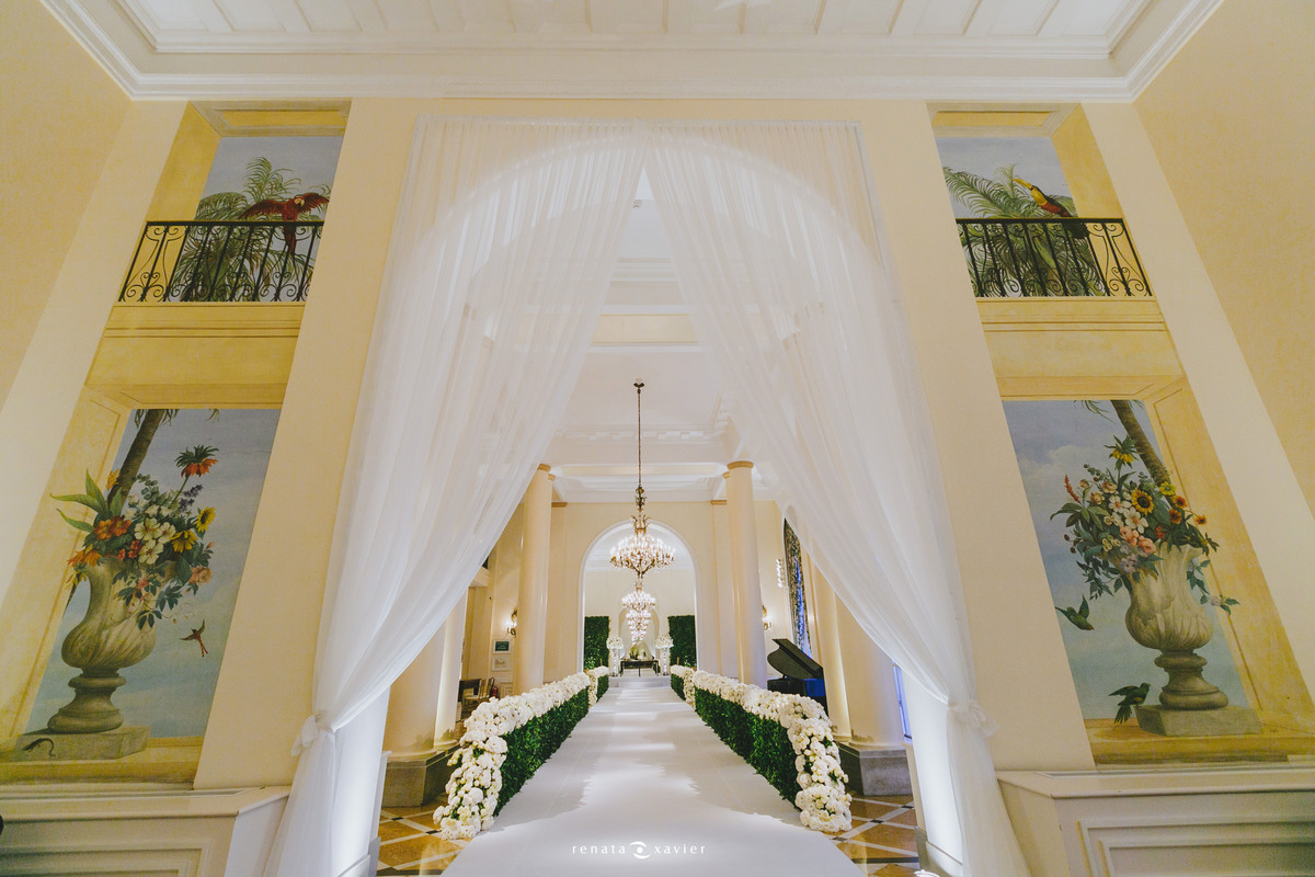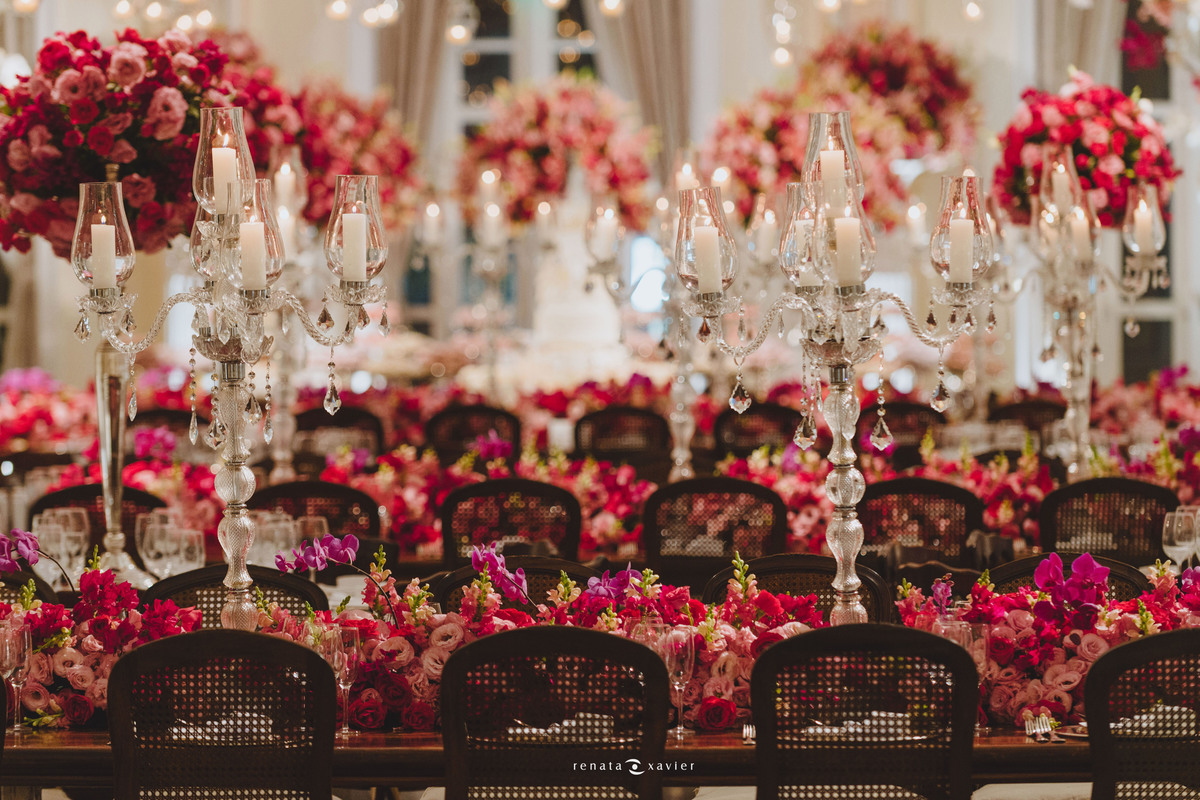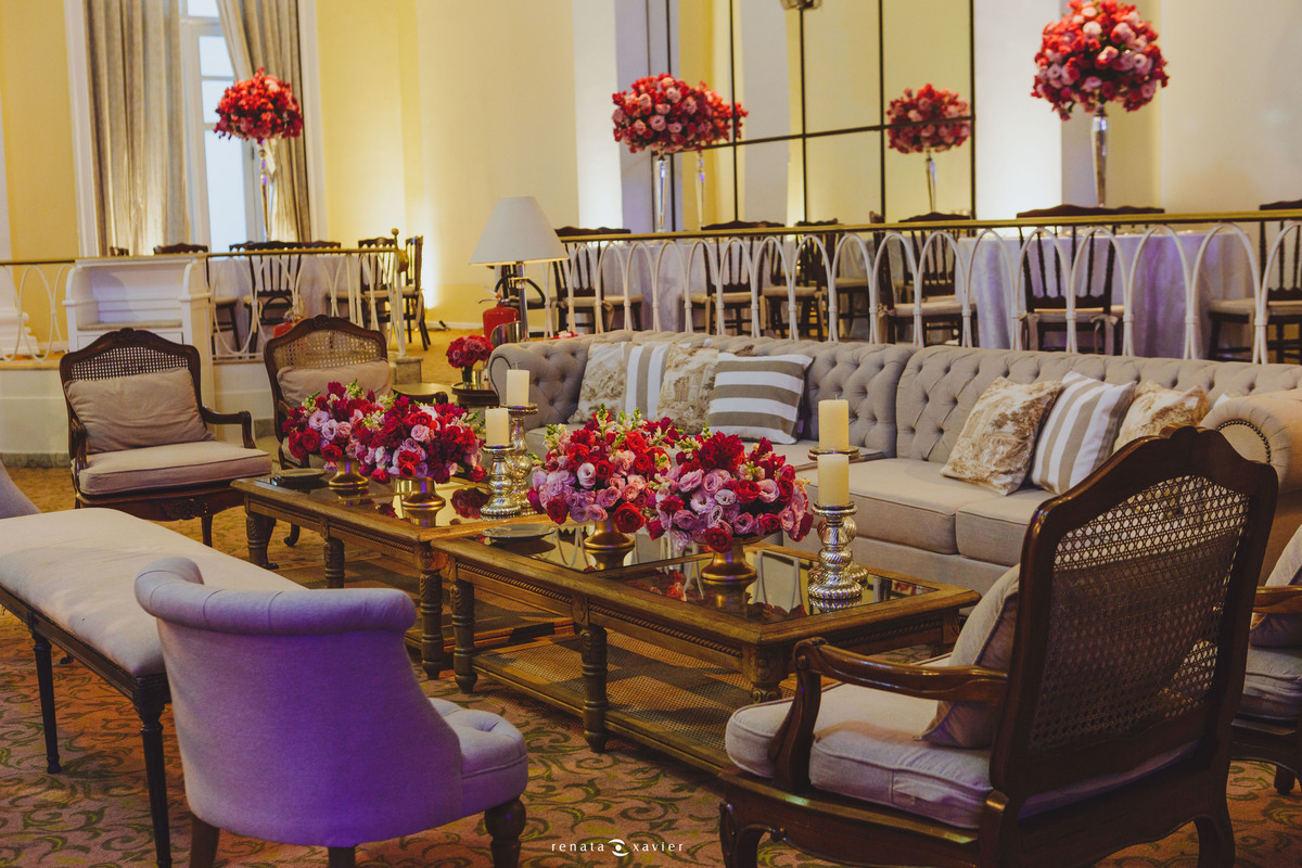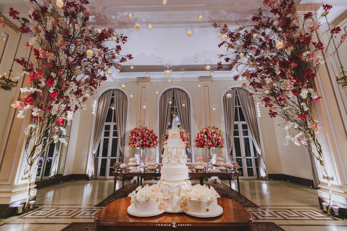 A decoração que o Daniel Cruz fez nos salões do Copacabana Palace estava um escândalo! Nos salões frontais, onde aconteceria a cerimônia, milhares de rosas e lisianthus brancos formavam o caminho dos noivos até o altar. No salão nobre do Copacabana Palace, uma mesa de doces no estilo La Vie en Rose, a mesa de jantar com a guirlanda de flores que ia até o chão. Os tetos estavam repletos de glicinias e bouganvilleas, o ponto alto era o candelabro gigante todo florido em cima do bar no Golden Room... Os convidados suspiravam...