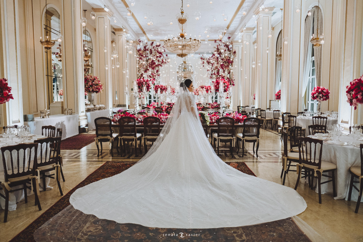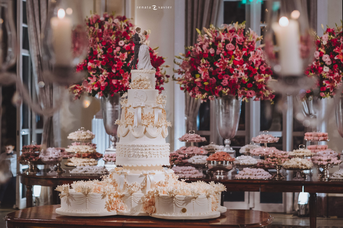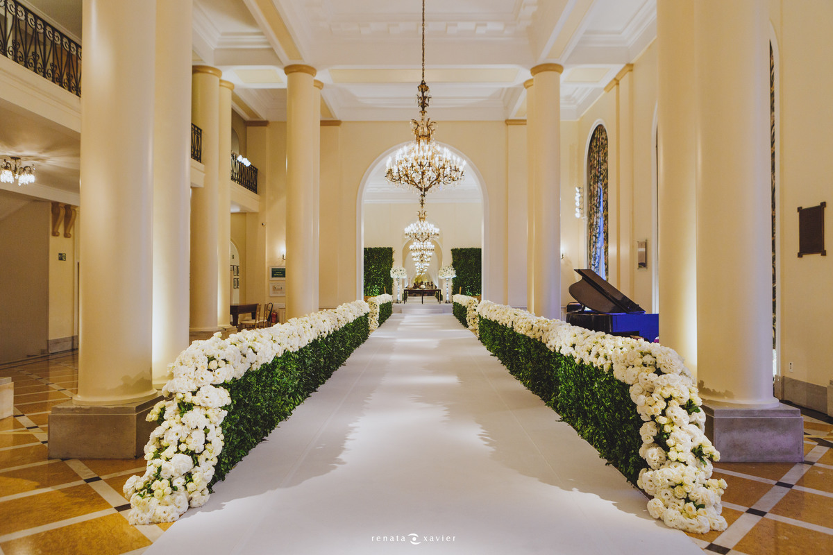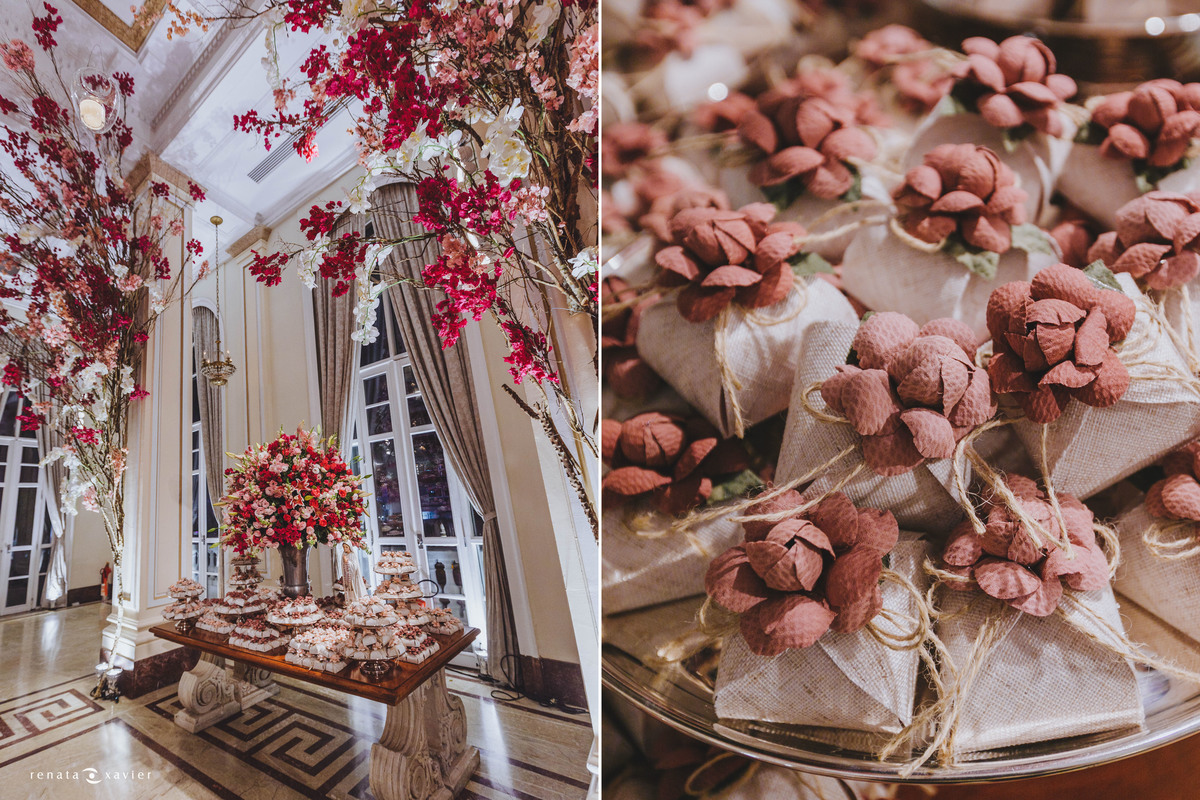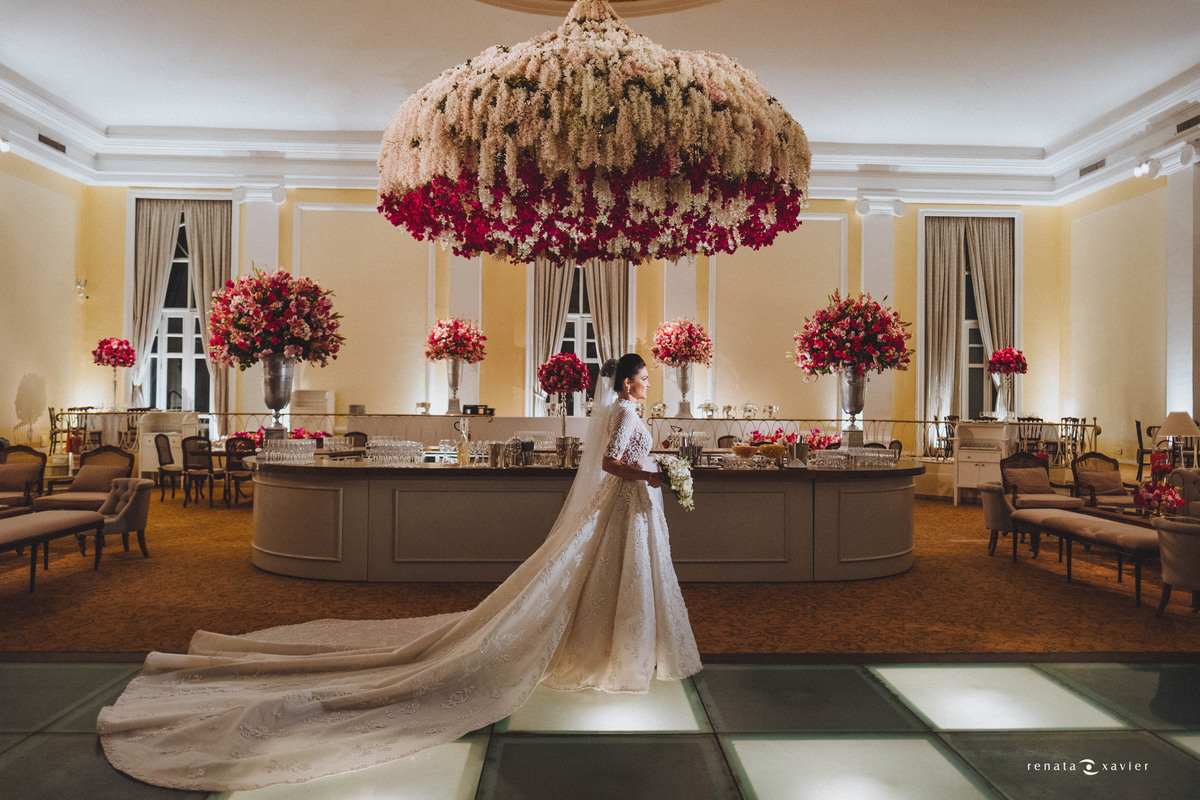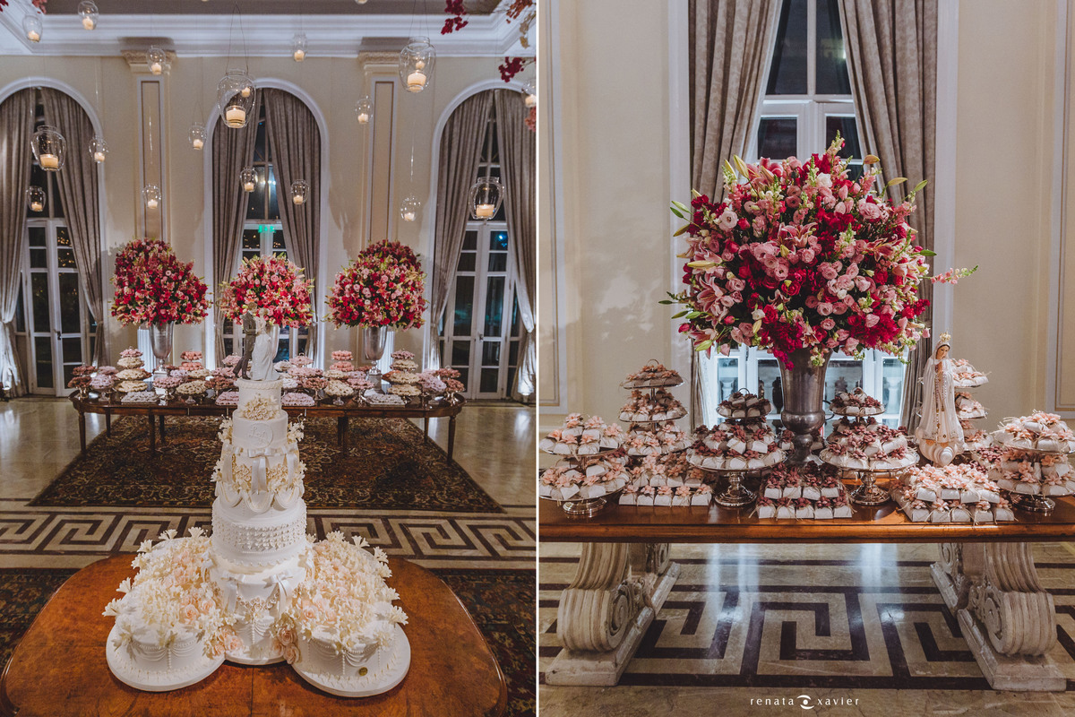A decoração que o Daniel Cruz fez nos salões do Copacabana Palace estava um escândalo! Nos salões frontais, onde aconteceria a cerimônia, milhares de rosas e lisianthus brancos formavam o caminho dos noivos até o altar. No salão nobre do Copacabana Palace, uma mesa de doces no estilo La Vie en Rose, a mesa de jantar com a guirlanda de flores que ia até o chão. Os tetos estavam repletos de glicinias e bouganvilleas, o ponto alto era o candelabro gigante todo florido em cima do bar no Golden Room... Os convidados suspiravam...